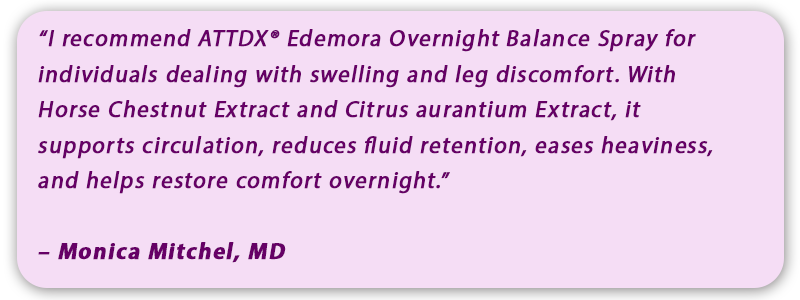 ATTDX® Edemora Overnight Balance Spray is infused with these powerful ingredients to target swelling, restore comfort, and help legs feel lighter and refreshed.