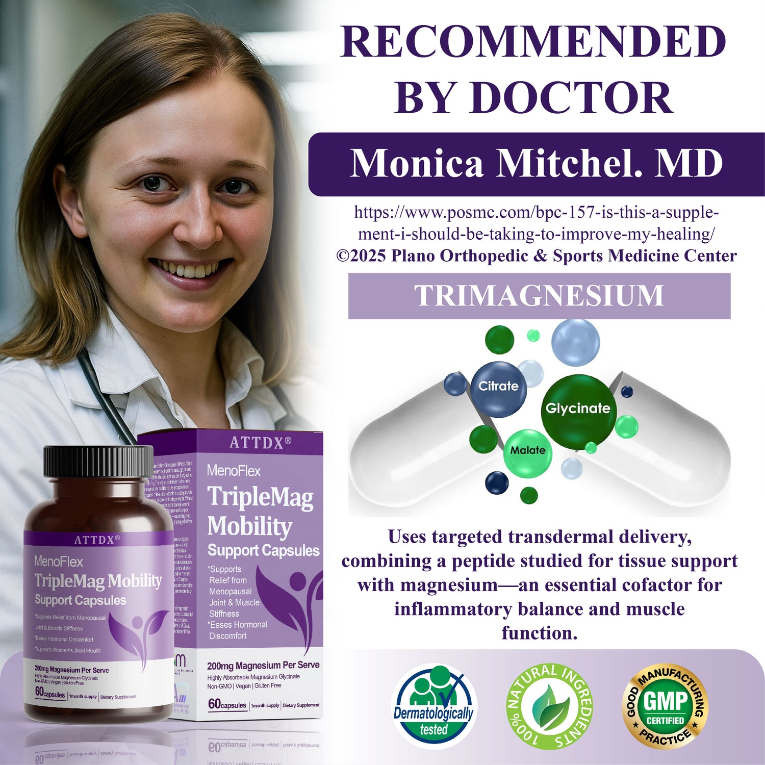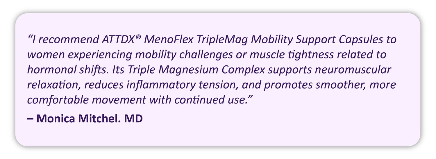 ATTDX® MenoFlex TripleMag Mobility Support Capsules use the Triple Magnesium Complex for superior absorption, helping calm inflammation, relax tense muscles, and restore daily comfort from within.