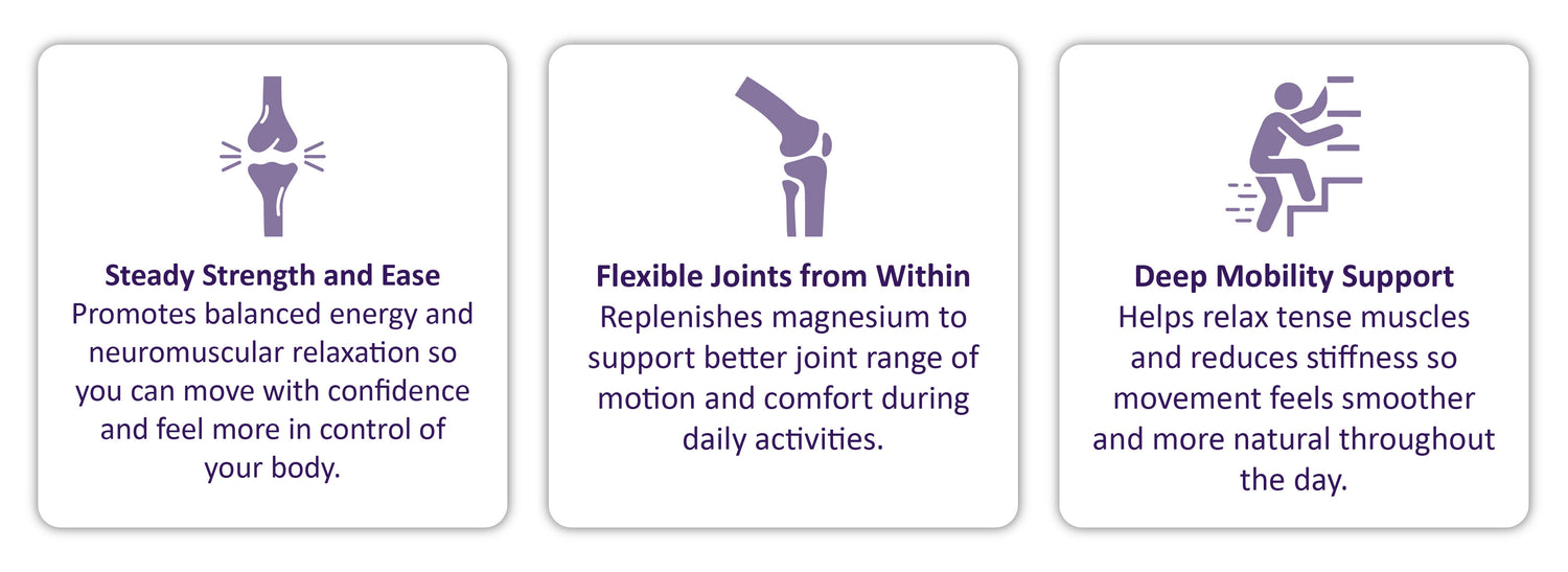 Research shows that magnesium deficiency contributes to increased musculoskeletal pain and reduced mobility in menopausal women. Bioavailable forms such as Glycinate, Malate, and Citrate are absorbed more efficiently than standard magnesium.