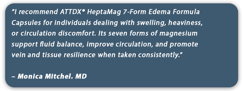 By addressing the magnesium deficiency that often contributes to swelling and vascular discomfort, ATTDX® HeptaMag 7-Form Edema Formula Capsules provide deeper and longer lasting relief than single form supplements or surface level treatments.