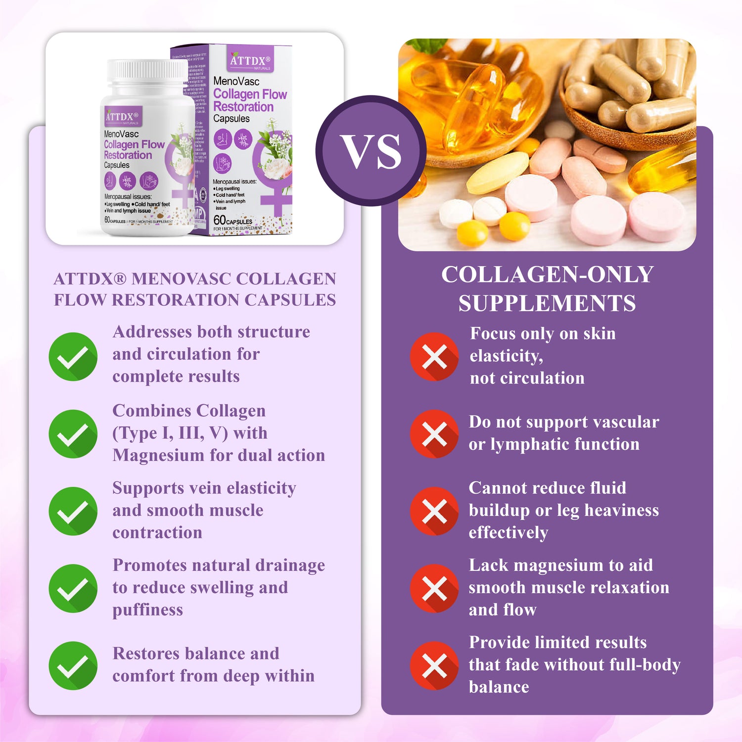 Choose ATTDX® MenoVasc Collagen Flow Restoration Capsules for targeted support that helps reduce leg swelling and heaviness. Its Collagen Complex and magnesium work together to strengthen vessel walls and promote smooth fluid movement. This dual-action formula provides lasting comfort, lighter legs, and improved circulation from deep within.