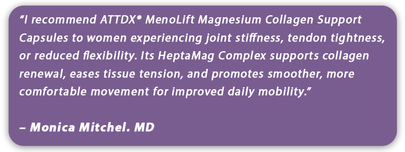 ATTDX® MenoLift Magnesium Collagen Support Capsules, powered by seven highly bioavailable forms of magnesium in the HeptaMag Complex, help activate the natural enzymes responsible for forming collagen while easing tissue stiffness linked to low magnesium levels.
