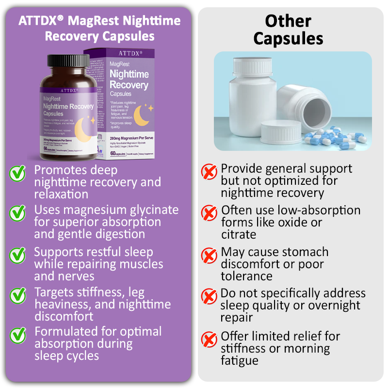 ATTDX® MagRest Nighttime Recovery Capsules: Infused with Magnesium Glycinate, Lavender Extract, Vitamin B6, and Vitamin D3 to support deep relaxation, nerve calmness, and restorative sleep.