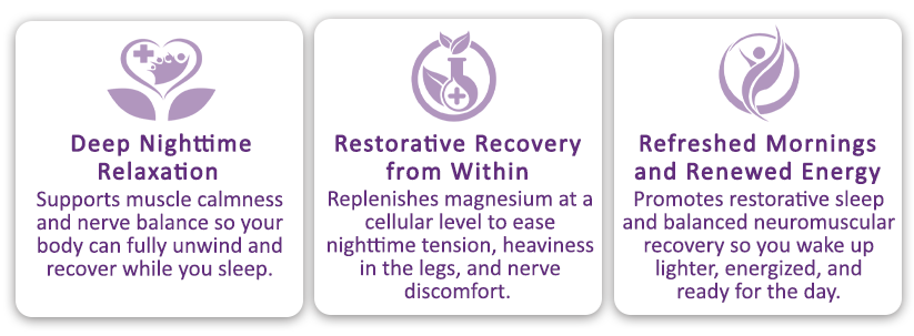 By correcting magnesium insufficiency at its root, it helps reduce nighttime joint pain, heaviness or fatigue in the legs, nerve tension, and morning fatigue. This leaves you refreshed, balanced, and ready for the day ahead.