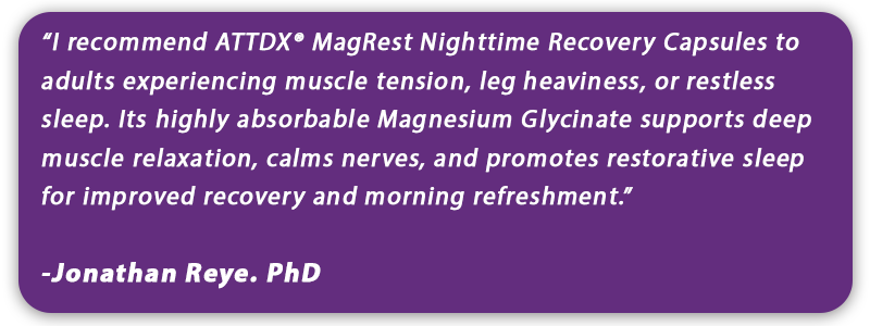 ATTDX® MagRest Nighttime Recovery Capsules provide highly absorbable Magnesium Glycinate to address magnesium deficiency, which affects nearly 50 percent of adults and contributes to muscle cramps, restless sleep, and poor recovery. Evening magnesium intake enhances absorption and optimizes GABA activity, supporting calmness and restorative sleep.